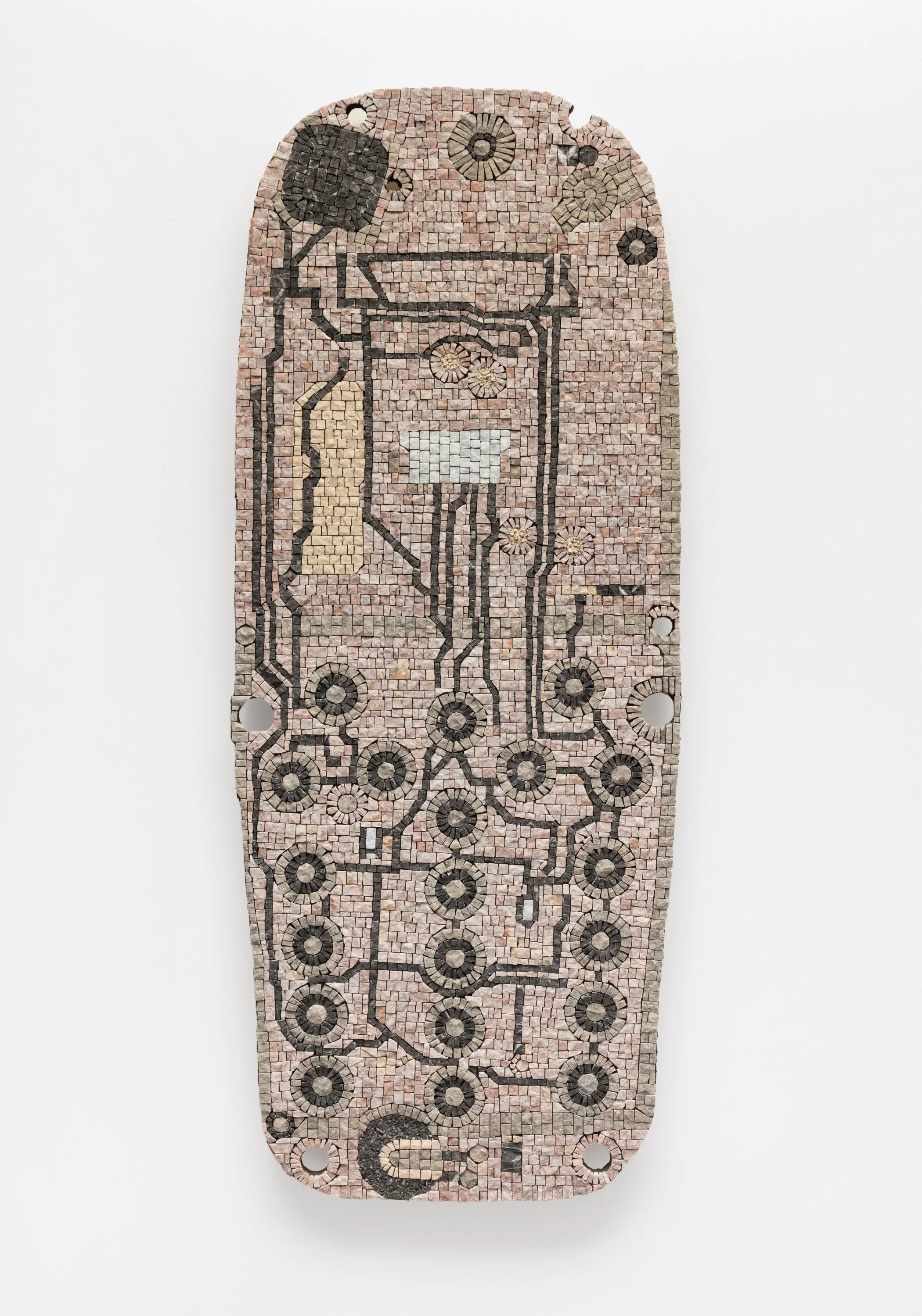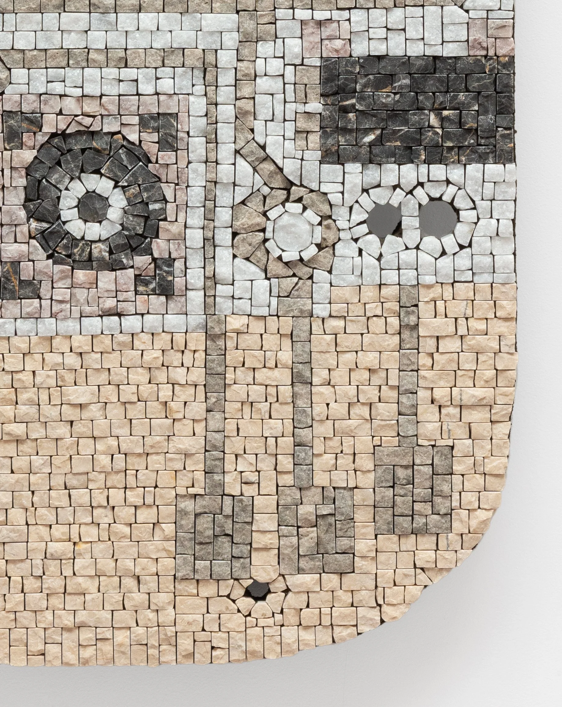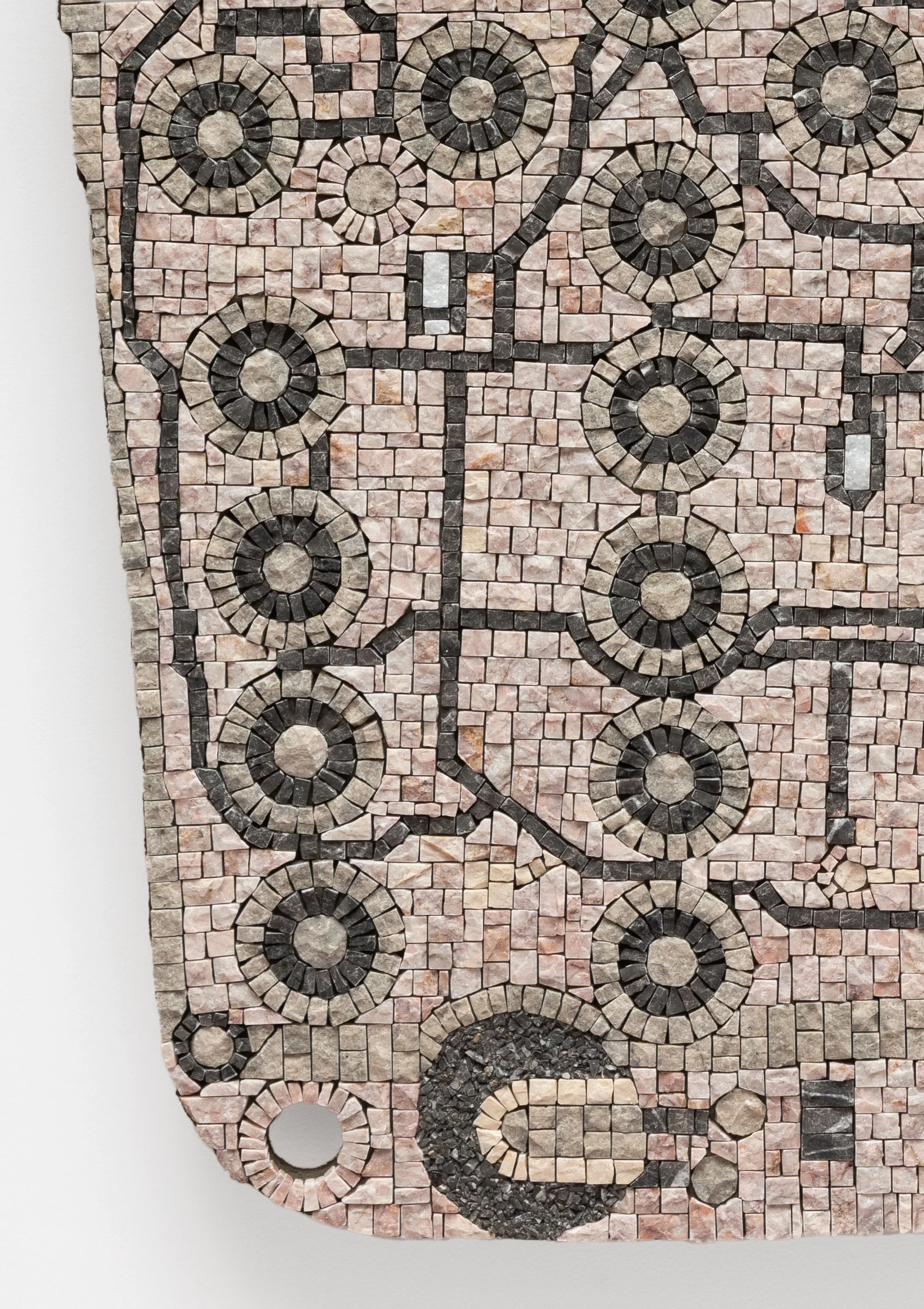 We Were Here, 2025, salvaged marble floor tiles, cement, plywood and found objects, Zalucky Contemporary, Toronto, ON.